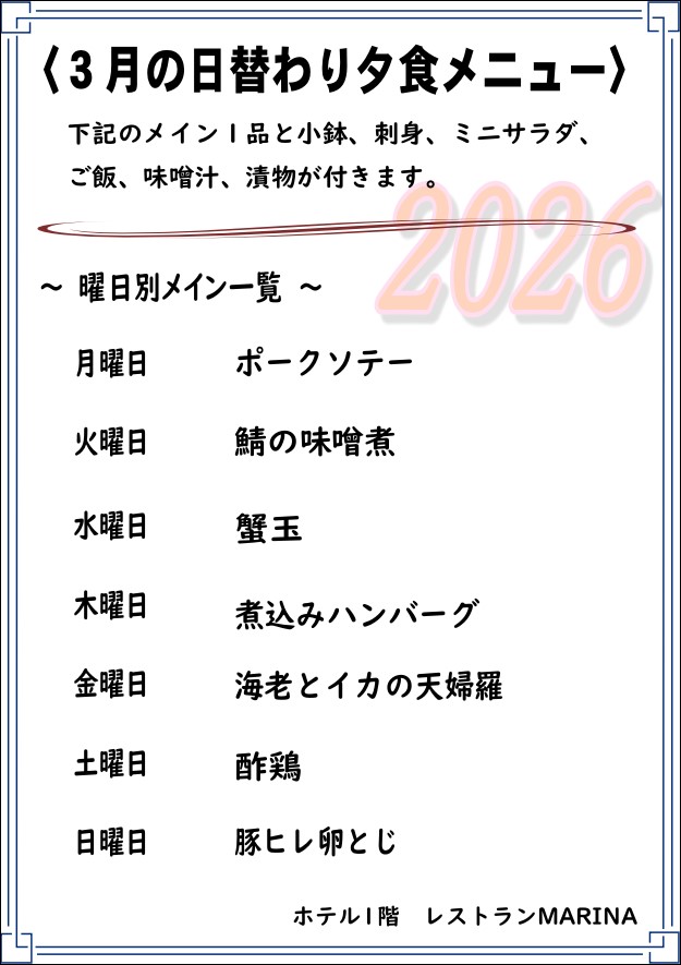 3月の日替わりご夕食メニュー